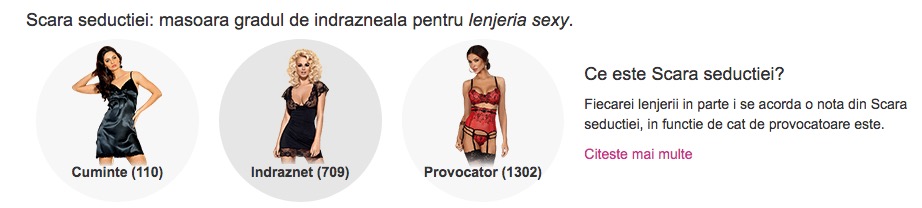 SevenSins iti pune la dispozitie de acum inainte posibilitatea de a alege produsele de lenjerie intima in functie de nivelul de erotism. Ce inseamna asta? Inseamna ca fiecarei lenjerii in parte i se acorda o nota din Scara seductiei, in functie de cat de provocatoare este.